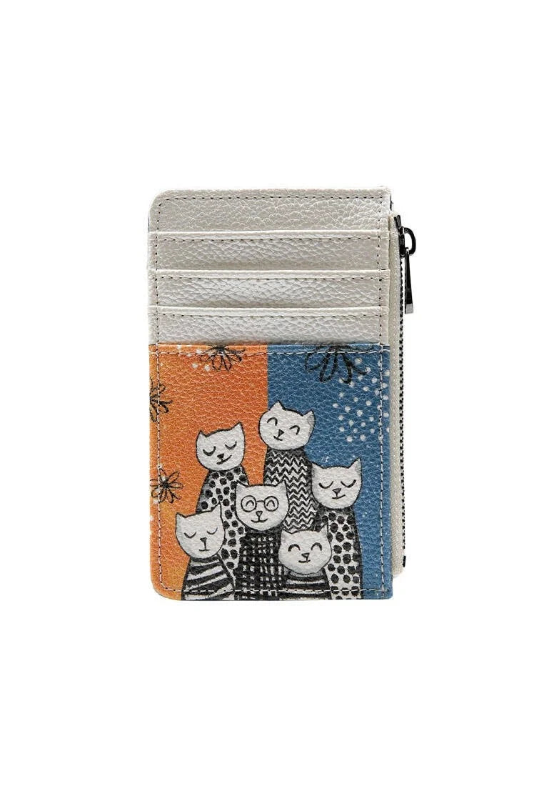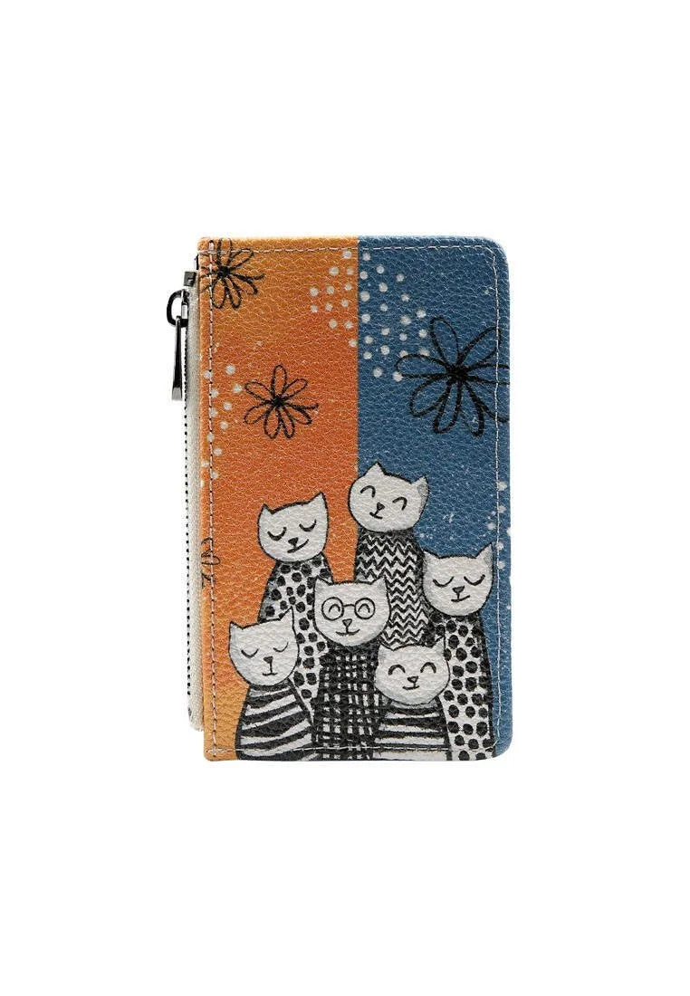 Elevate your accessory game with the Cardie C Wallet, featuring the charming Family Portrait Design. This multicolored, vegan wallet, perfect as a cardholder for women, showcases adorable cats in vibrant orange and blue. Add a splash of color and eco-friendly style to your everyday look with this delightful accessory.