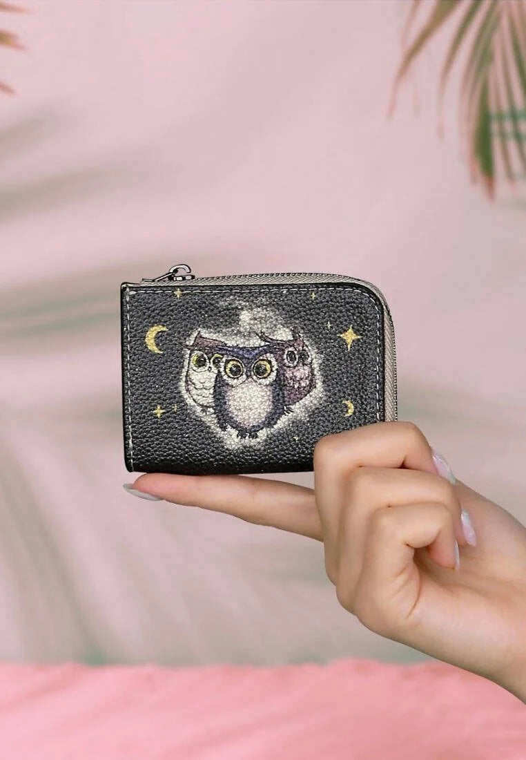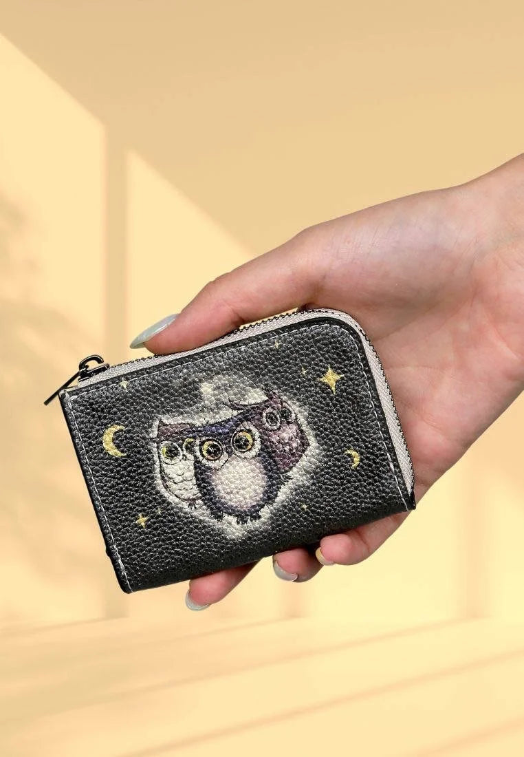 Enhance your accessory collection with the Coincy Wallet, which is perfect for women who appreciate unique designs. This navy blue vegan wallet, adorned with the Owls Family design, is ideal for use as a coin purse. Featuring charming owls, it seamlessly combines functionality with eco-friendly materials. Make a stylish and sustainable statement with this enchanting wallet.