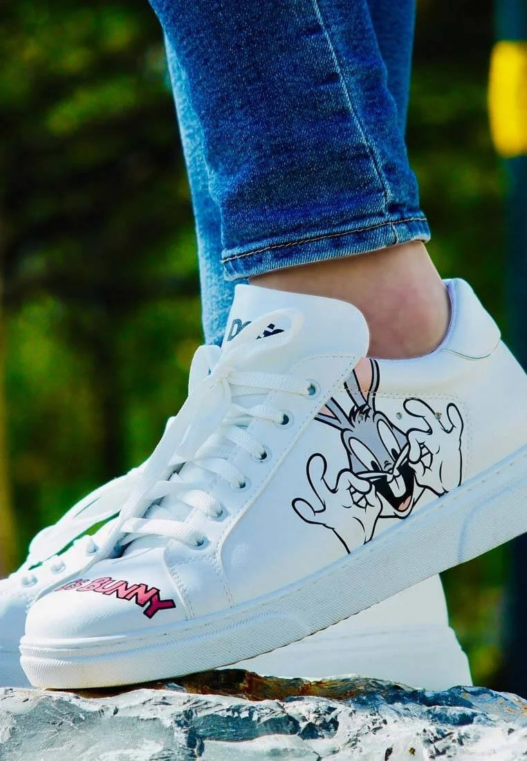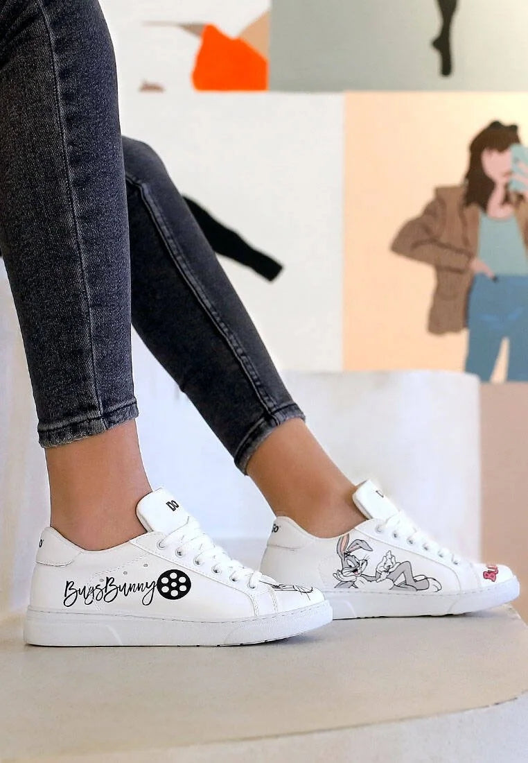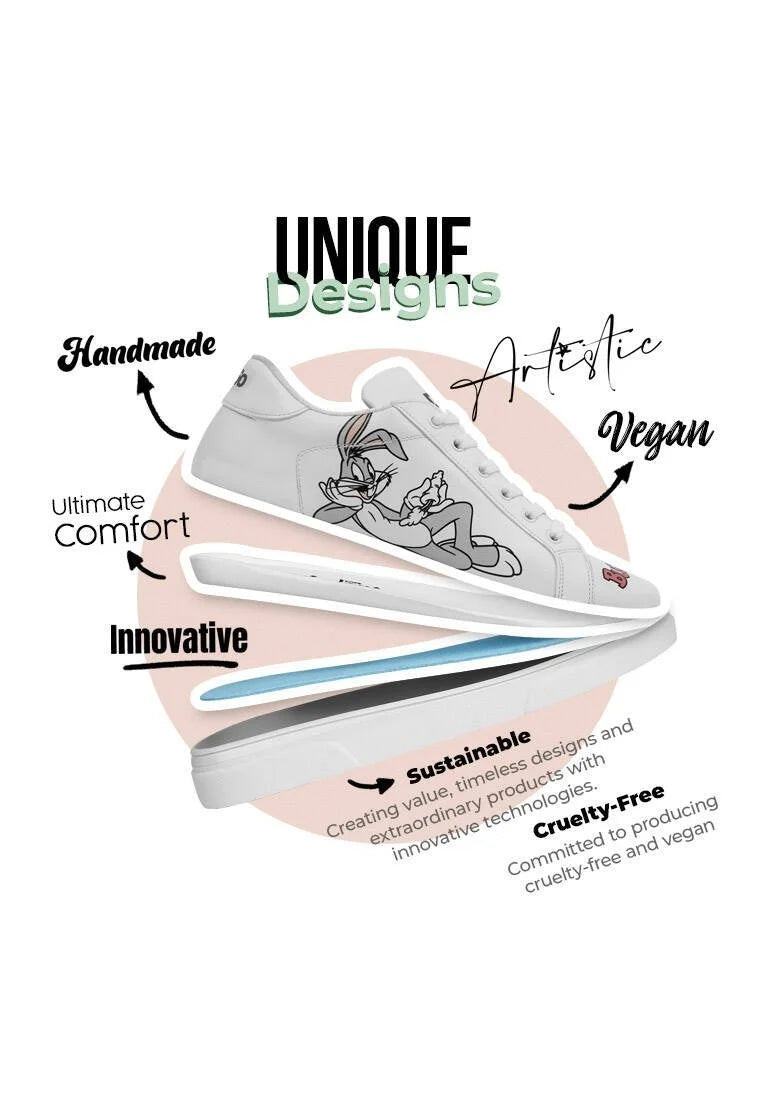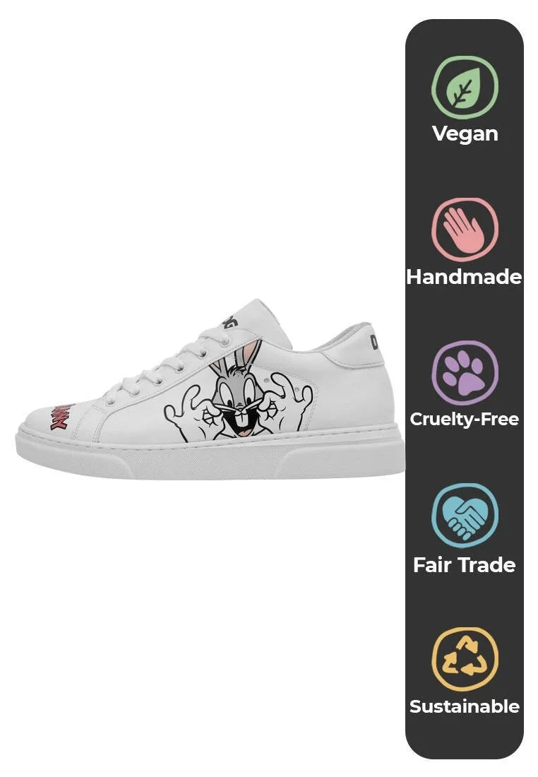 Women Vegan Leather White Sneakers - What's Up Doc? Bugs Bunny Design